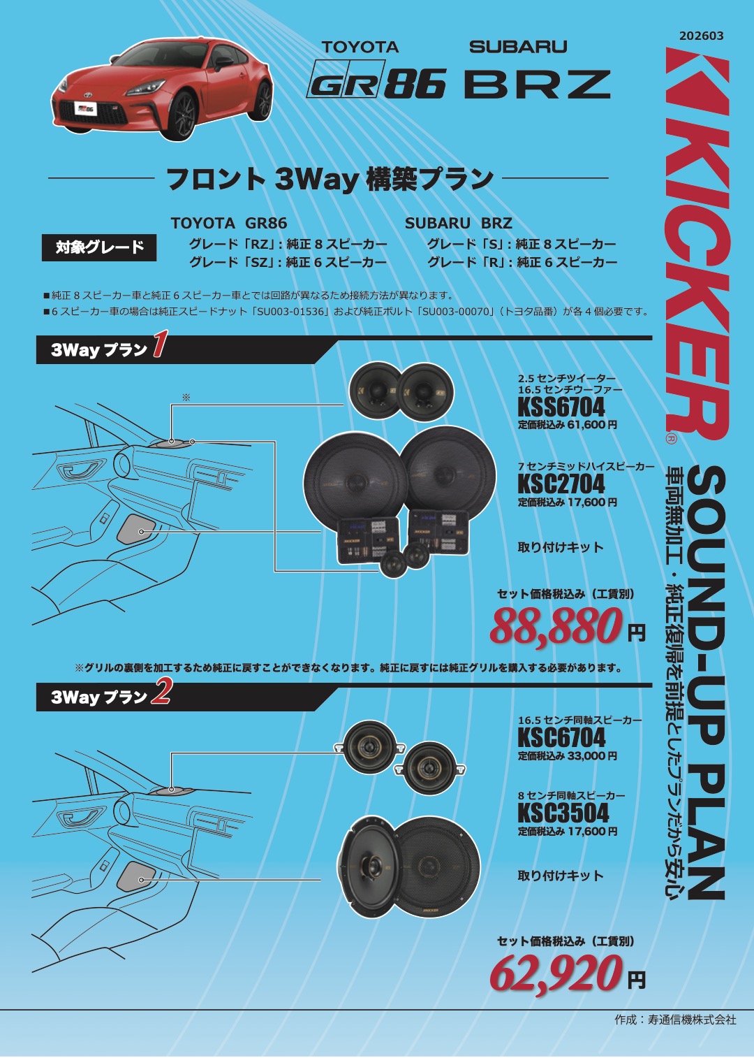 キッカーサウンドアッププラン トヨタ GR86 スバル BRZ (フロント3Way構築プラン)