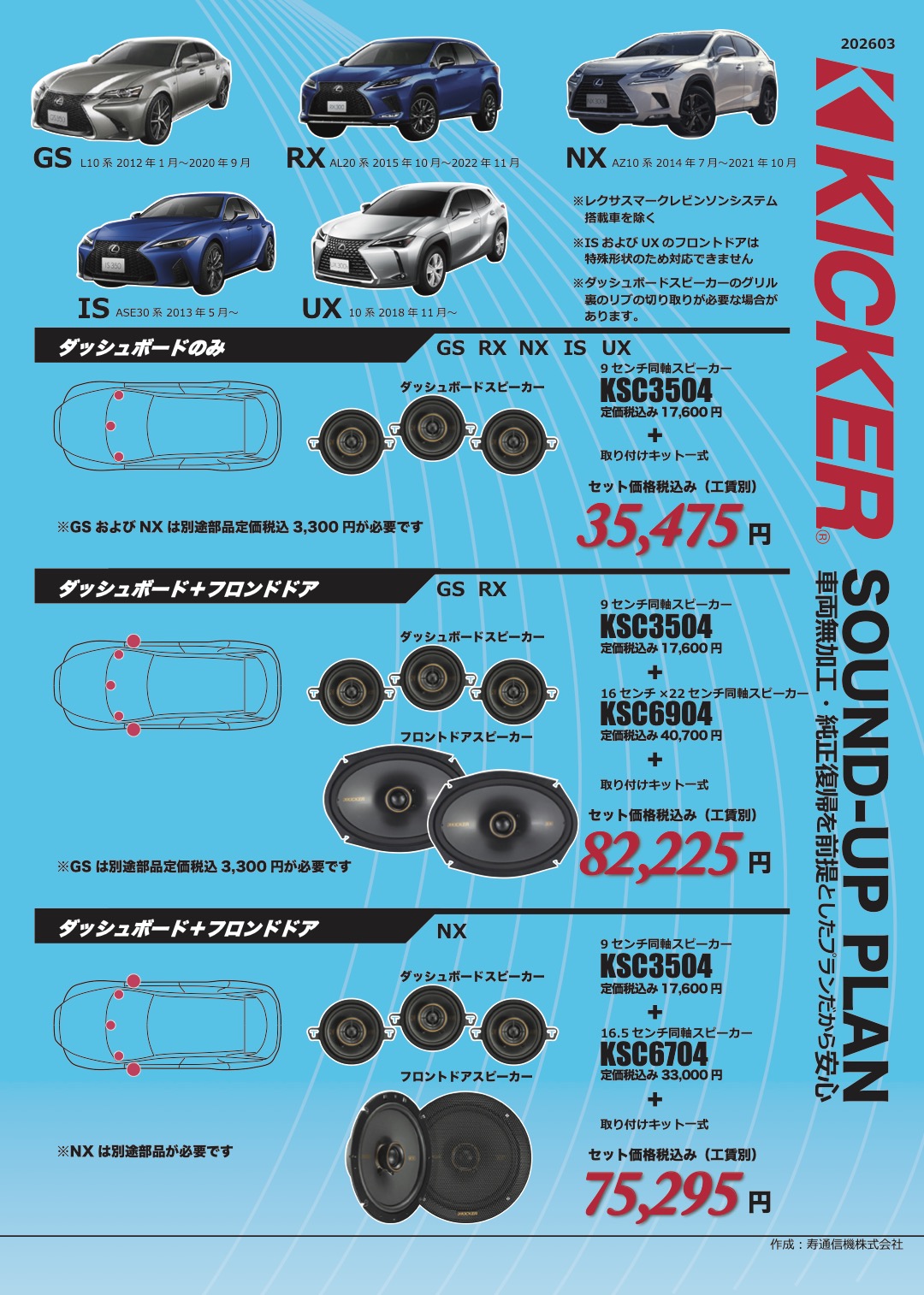 キッカーサウンドアッププラン レクサスGS(L10系 2012/1~2020/9) RX(AL20系 2015/10~2022/11) NX(AZ10系 2014/7~2021/10) IS(ASE30系 2013/5~ ) UX(10系2018/11~)
